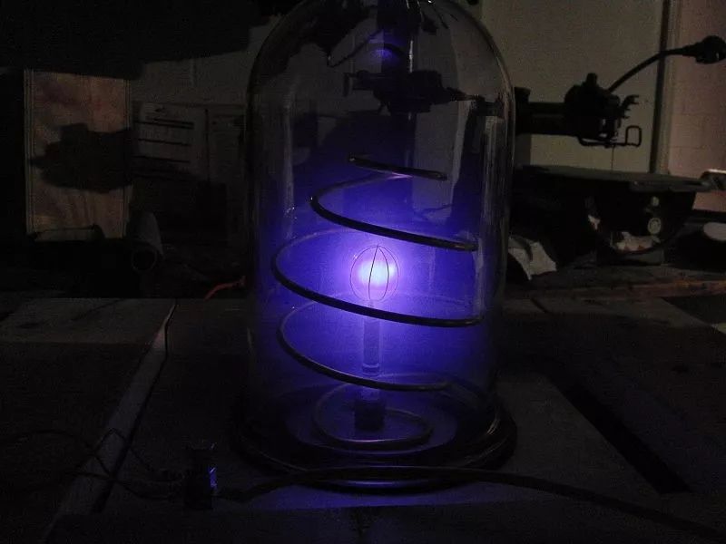 一台正在发光的fusor,其中正有几个离子发生了核聚变(图片来源:wiki)