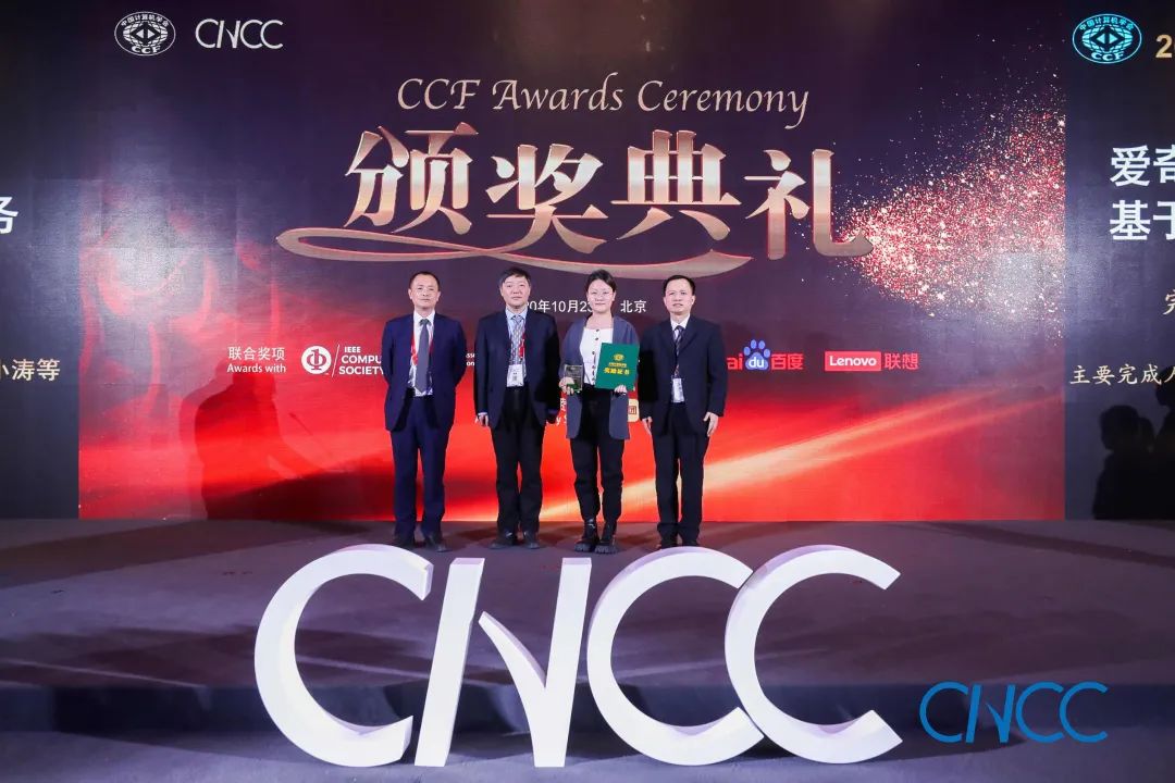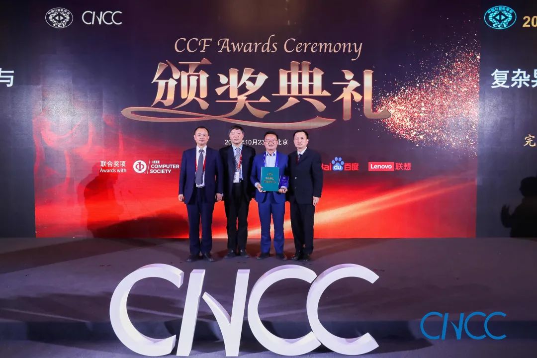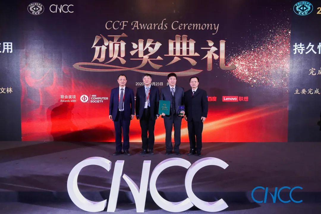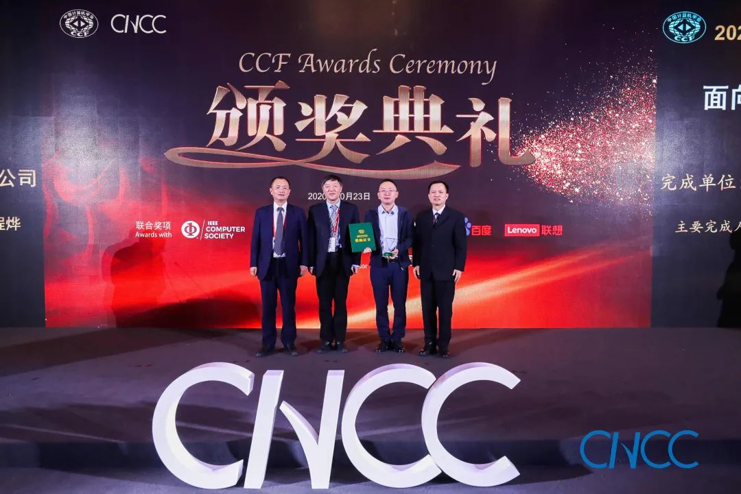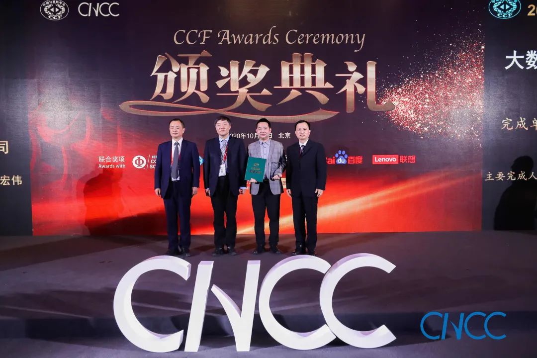 CCF 理事长梅宏教授(左一)、百度校园品牌部总监李轩涯博士(右一)为郭得科教授颁奖