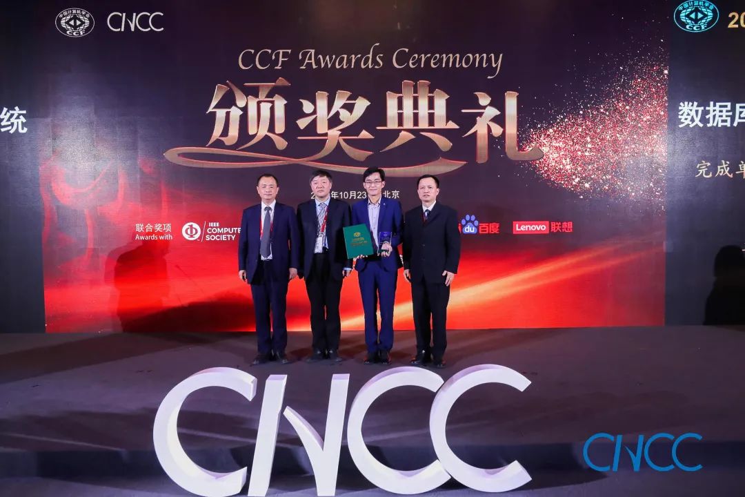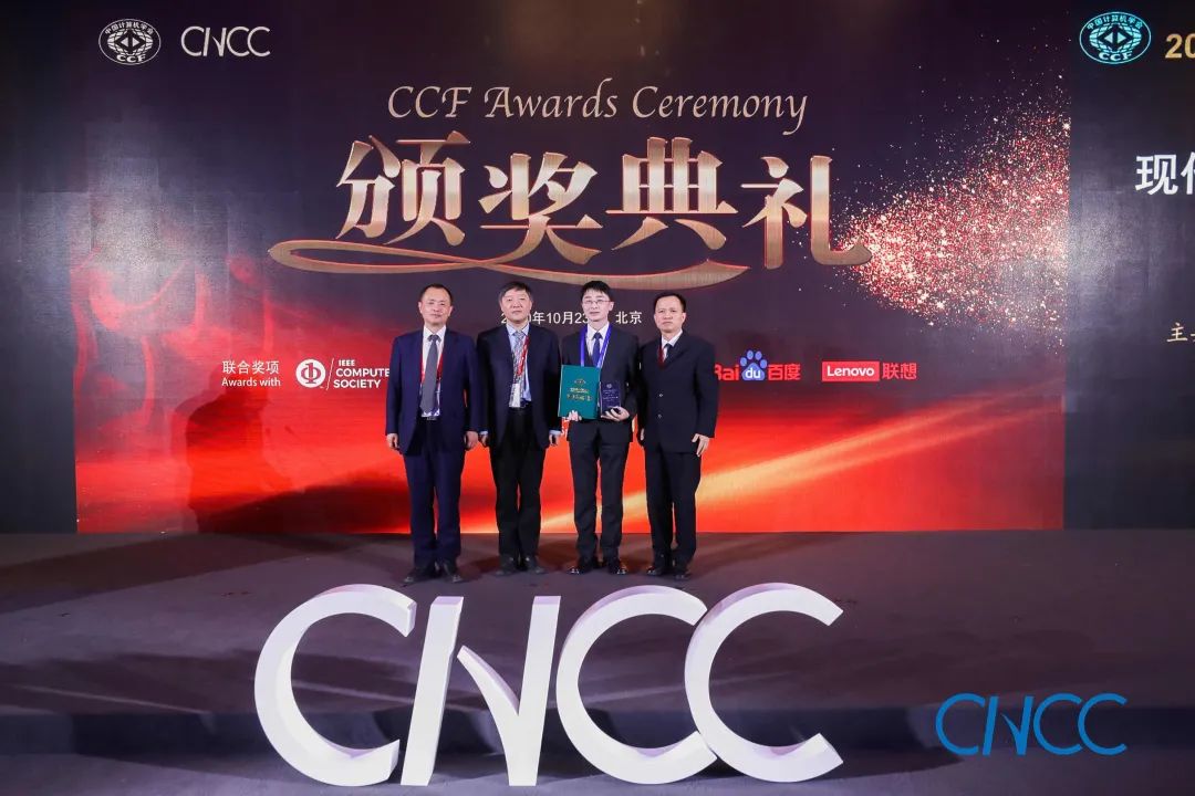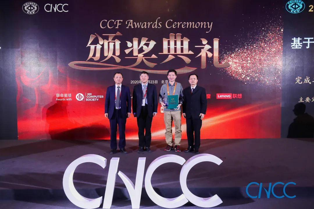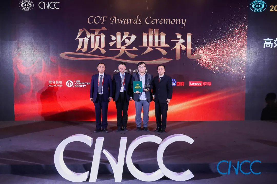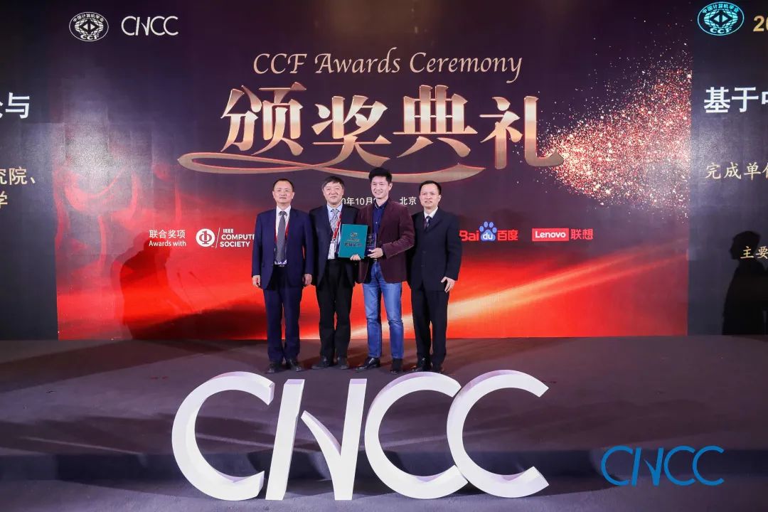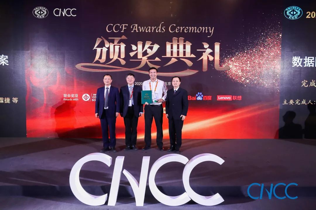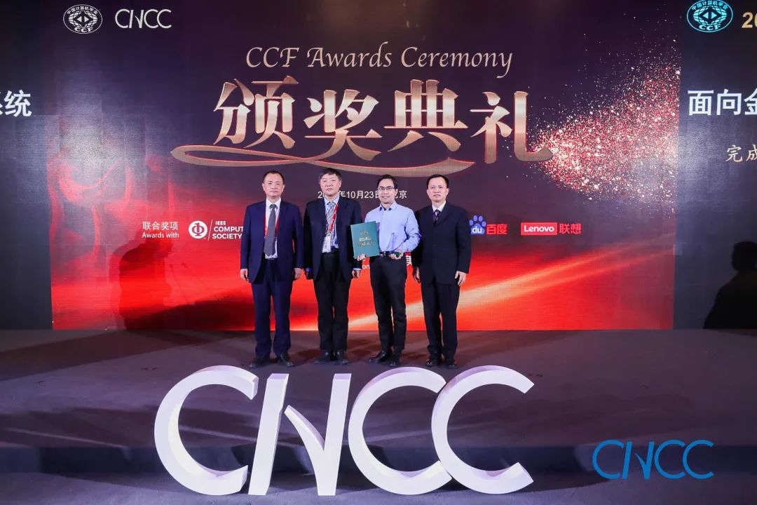 CCF 理事长梅宏教授(左一)、百度校园品牌部总监李轩涯博士(右一)为翟季冬副教授颁奖