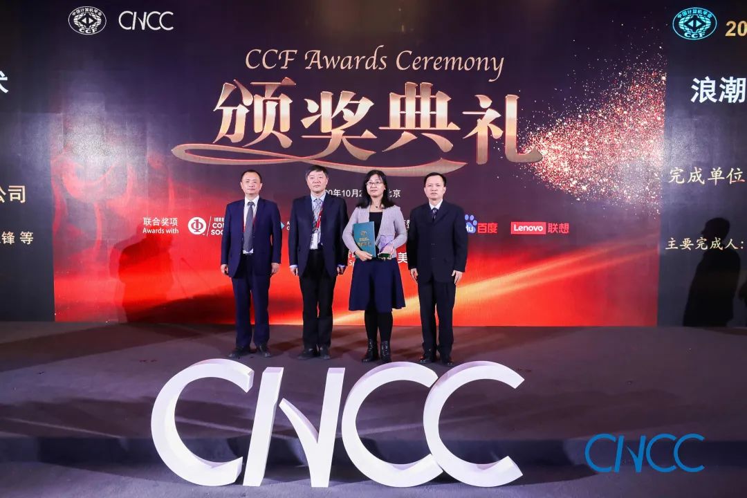 CCF 理事长梅宏教授(左一)、联想集团副总裁王茜莺博士(右一)为周志华教授颁奖