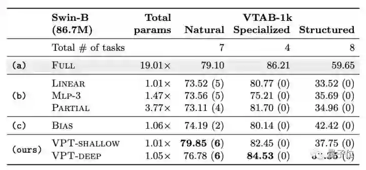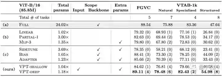 和其他微调方法相比(b、c组),VPT-Deep的性能则全部胜出。