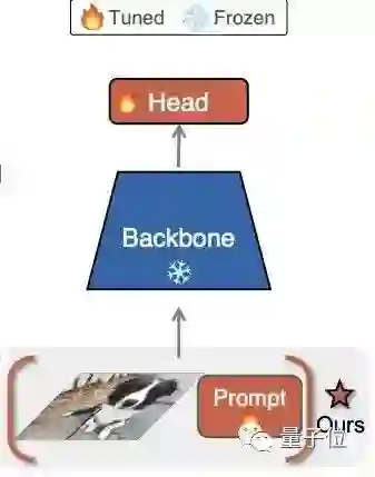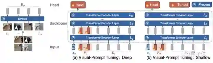 具体来说,比起全面微调,VPT受最新大型NLP模型调整方法的启发,只在输入空间中引入少量可特定某任务训练的参数(不到模型参数的1%),同时在训练下游任务期间冻结(freeze)预训练模型的主干。