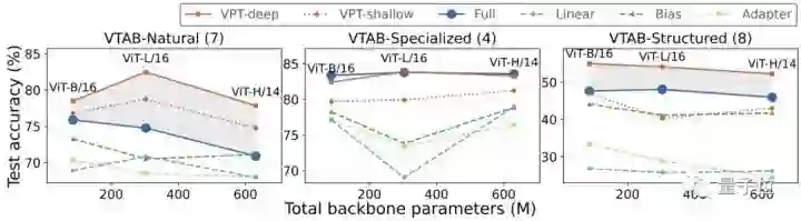 此外,选择不同主干参数规模和模型规模的ViT(ViT-B、ViT-L和ViT-H)进行测试还发现,VPT方法不会受影响,依然基本保持性能领先。