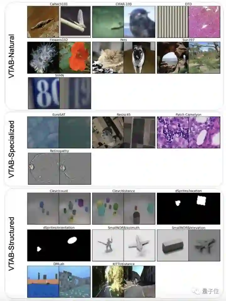 (2)由19个不同视觉分类集合组成的VTAB-1k,细分为使用标准相机拍摄的自然图像任务(Natural)、用专用设备(如卫星图像)捕获的图像任务(Specialized)以及需要几何理解的任务(Structured),比如物体计数。