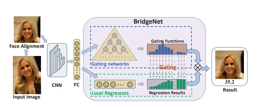 年龄估计是计算机视觉中一个重要且具有挑战性的问题。 现有的年龄估计方法通常采用分治法来解决非平稳老化引起的异构数据。 然而,面部衰老过程也是一个连续过程,不同年龄之间的连续关系还没有得到有效的挖掘。 在这篇文章中,作者 提出了一 种称为 B ridgeN et的模型进 行年龄估 计,能够 有效地 挖 掘年龄标签 之间的连续关系。