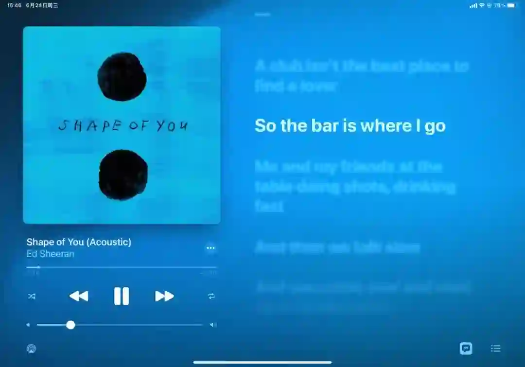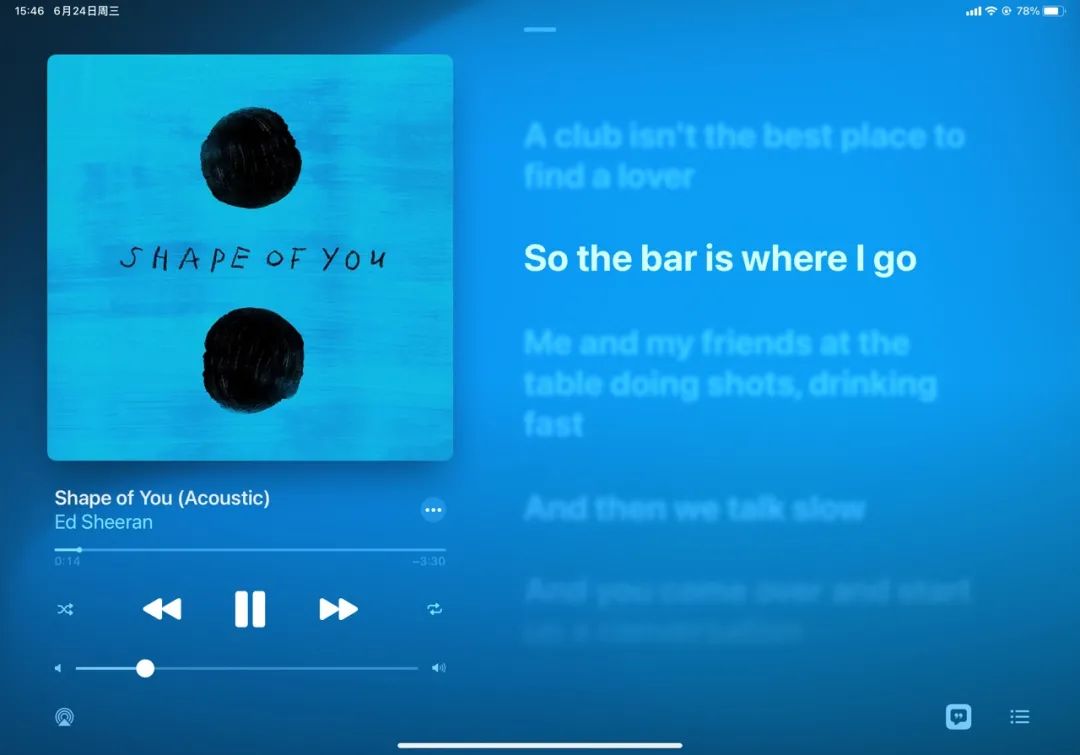 Apple Music 在 iPadOS 14 上得以适配,歌词放置在屏幕右侧,整体观感更加统一。