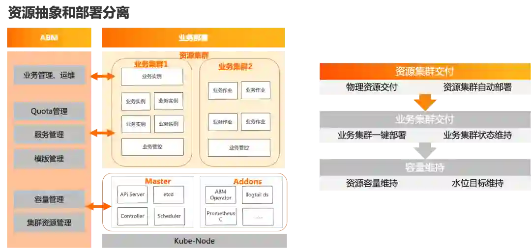 Hologres 是完全基于云原生的方式设计和实现的,通过存储计算分离的方式,解耦了计算资源和存储资源;其中计算节点的部署通过K8s集群进行部署和拉起。通过自研的运维管理系统ABM,在集群交付上,我们对集群进行抽象设计,分离出资源集群和业务集群的概念;资源集群的交付,ABM和底层平台进行打通,进行资源集群的创建和容量维持;在业务集群上,ABM提供基于K8s 概念的部署模板,将管控等节点在资源集群上快速拉起,完成交付。