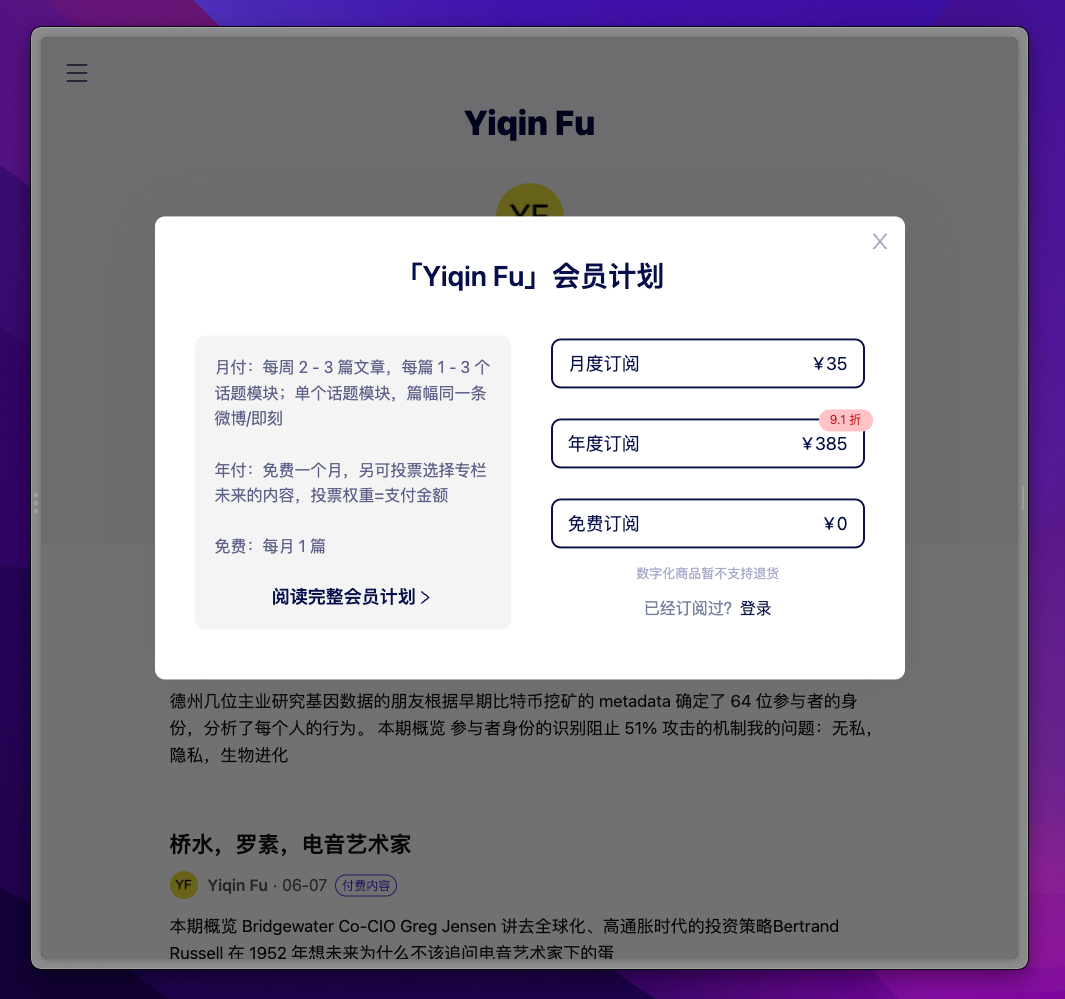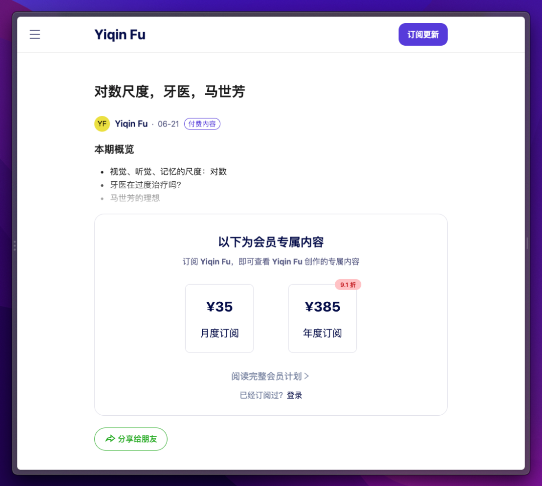 解决方案,使得创作者可以直接向读者收取订阅费,不仅支持同时发布付费作品和免费作品,也可以把文章中的某一部分内容设置为订阅可见,通过这样的办法可以将读者转化为付费会员,以此获得更稳定的续费率和更高的转化率,也可以帮助读者了解作品方向对自己的契合度,进而通过付费获得平滑的体验升级。