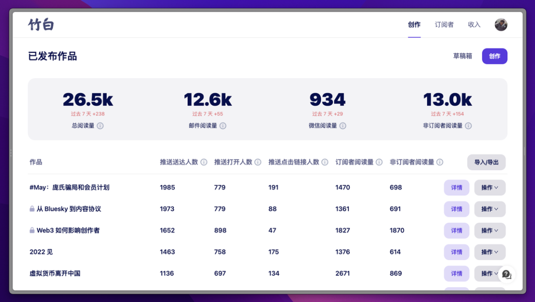 过去我们常用播放数、点赞数等绝对数值来评价内容的好坏,但实际上这些指标只是一些浅层的虚荣指标,我们更在意创作者和读者之间的连接,因此竹白提供作品从发送、打开、互动的完整数据指标,帮助创作者更好的了解自己的作品消费情况,同时区分出非订阅者数据,更好获知作品的「出圈」程度,来便捷的知晓作品是否真正被喜爱。