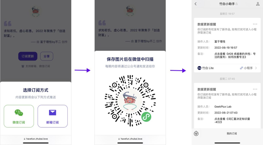 竹白支持了微信和邮件订阅,让创作者可以在接触到读者的同时允许他们选择适合自己的方式订阅,这样读者既能更加及时高效地收到创作者的更新,创作者也可以在一处了解不同渠道读者的访问以及互动情况。