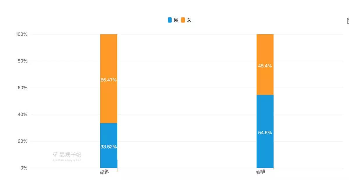 两套截然不同的产品和运营思路下,闲鱼和转转的用户群体也很不同。转转上的男、女性别用户分别是6.5:3.5,手机数码是第一大品类;闲鱼则更女性用户更多,闲鱼交易量最高的前三类品类则是:服装、手机数码,以及美妆。