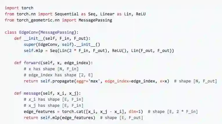 PyTorch Geometric大大简化了实现图卷积网络的过程。比如,它可以用以下几行代码实现一个层(如edge convolution layer):