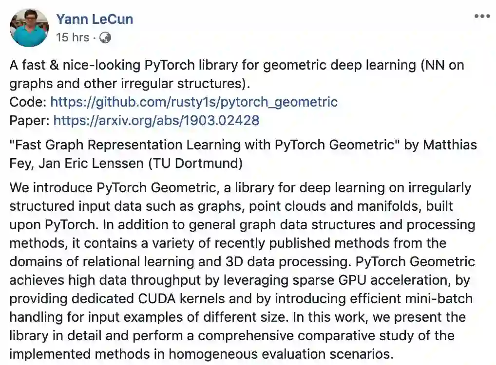图神经网络是最近 AI 领域最热门的方向之一,很多图神经网络框架如 graph_nets 和 DGL 已经上线。但看起来这些工具还有很多可以改进的空间。近日,来自德国多特蒙德工业大学的研究者们提出了 PyTorch Geometric,该项目一经上线便在 GitHub 上获得 1500 多个 star,并得到了 Yann LeCun 的点赞。现在,创建新的 GNN 层更加容易了。