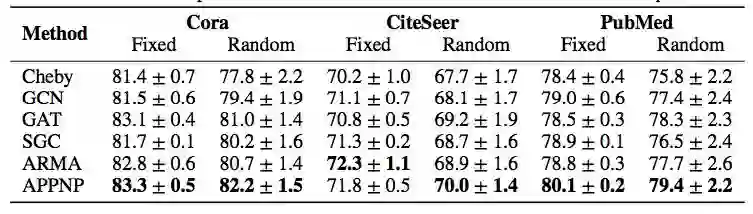 表 1:多个模型使用固定分割和随机分割的半监督节点分类结果。