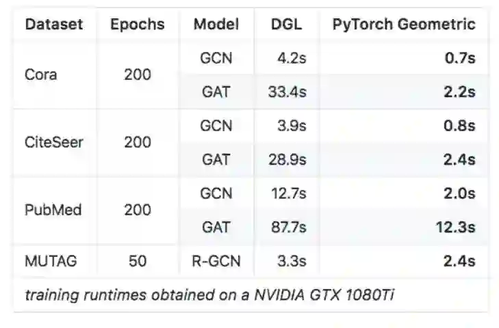 PyTorch Geometric 速度非常快。下图展示了这一工具和其它图神经网络库的训练速度对比情况: