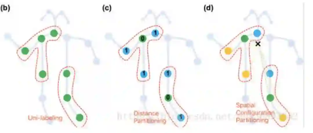 图(d)按节点与重心距离划分,距离重心更近(相对于中心节点)的1邻域节点为一个子集,距离重心更远的1邻域节点为一个子集,中心节点自身为1个子集。每个kernel的权重是一个3*N的向量。