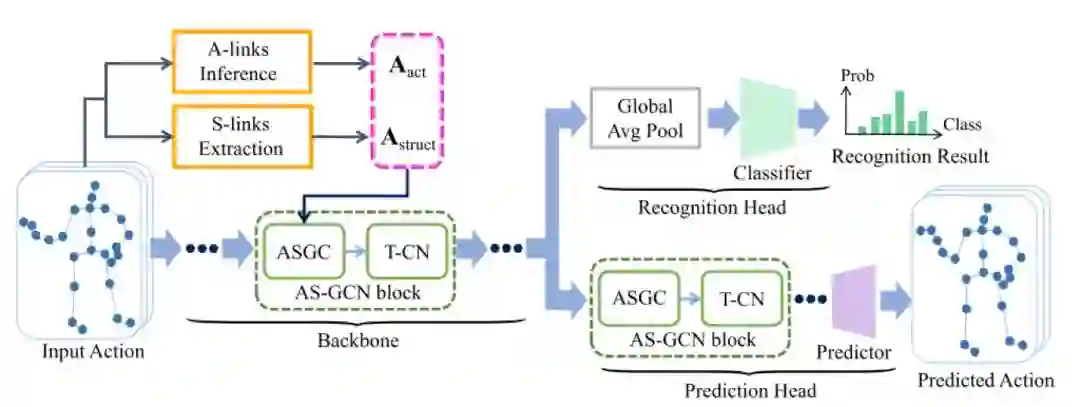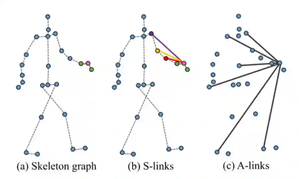 提出了AS-GCN,主要涉及了两种网络结构:Action-link和Structural-link。通过Action-link来发掘潜在的关节之间的联系,通过structual-link来发掘骨骼图的高阶关系。