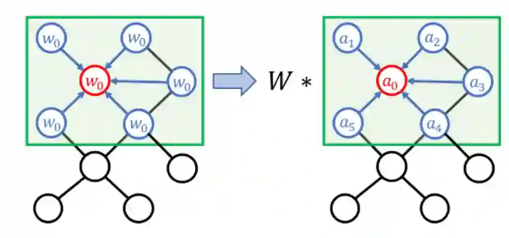 2. 权重是共享的,不会具体到每个节点,这和传统CNN相同。(直观的理解,如果权重是因节点而不同的,那么一旦图结构发生变化,权重就会立刻失效)