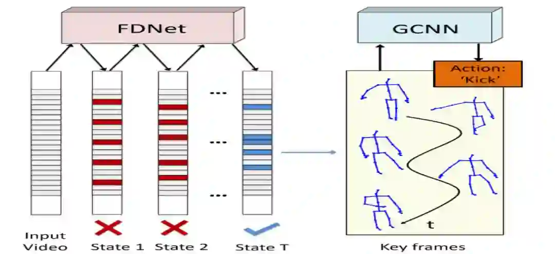 1.首先通过深度渐进式强化学习(DPRL),用类似蒸馏的方法逐步得从输入的动作帧序列中挑选最具识别力的帧,并忽略掉那些模棱两可的帧,这是一种类似于lstem中的attention的机制,只不过注意力只放在了时域上。对应的网络是frame distillation network(FDNet)。
