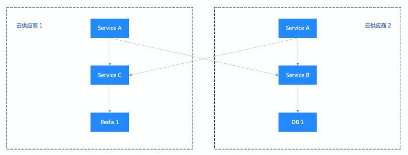 再极端一点,Service A 部署了双云,Service B 部署在云厂商 2、Service 1 部署在云厂商 1。那么不论哪个云出现故障,核心业务都受影响。此种部署架构下的故障率为 n + m,提升到 0.1%,被大大提高。