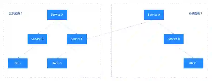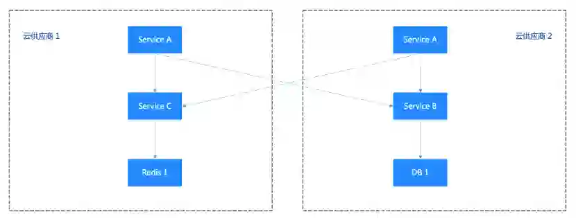 核心业务的调用链路一般是较复杂的树形,由根节点模块逐步发散。若其中存在一支调用链路,Service A 调用 Service B 和 Service C。其中 Service A、Service B 均为双云部署,Service C 仅部署在云厂商 1。那么当云厂商 1 出现严重故障时,核心业务受影响,无法提供服务。当云厂商 2 故障时,核心业务可以正常运行。这时的故障率为 max(n,m),取决于短板的云供应商。