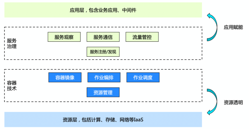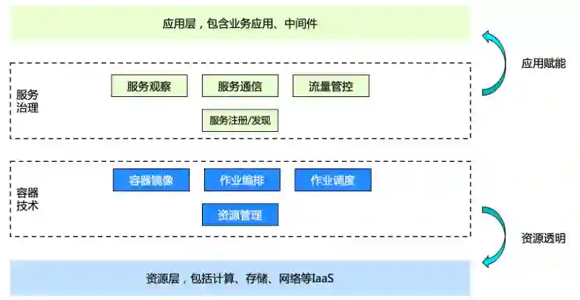 企业技术架构从大的层次来说,会分成两层:底下的一层是资源层,包括计算、存储、网络等 IaaS 资源;应用这个层面,有底下各种各样的 PaaS 组件,包括数据存储、消息队列、安全、大数据的等等,然后再往上一层是各种各样的业务中台,再往上的话就是具体的业务线。