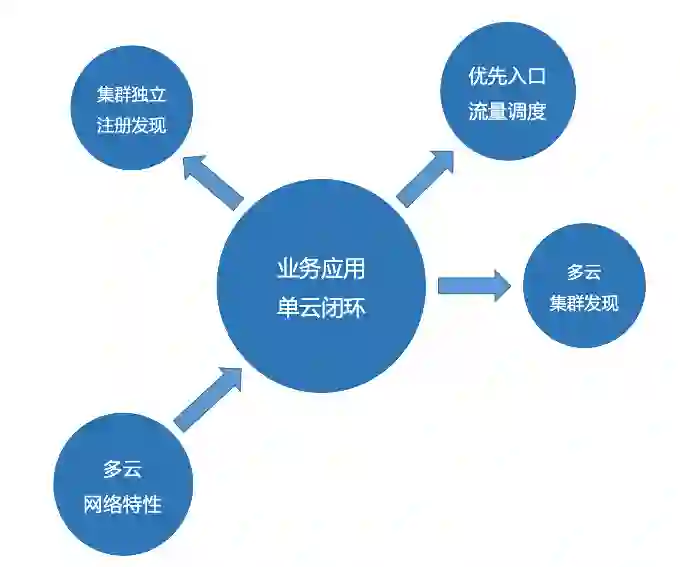 基于此,应用应尽可能地减少多云间的网络通信。除了数据存储的同步和写主外,常态的应用间调用应该闭环在单云内部。所以并不需要做一套纳管各云应用的服务注册发现机制,仅需要单云内部独立注册发现即可。
