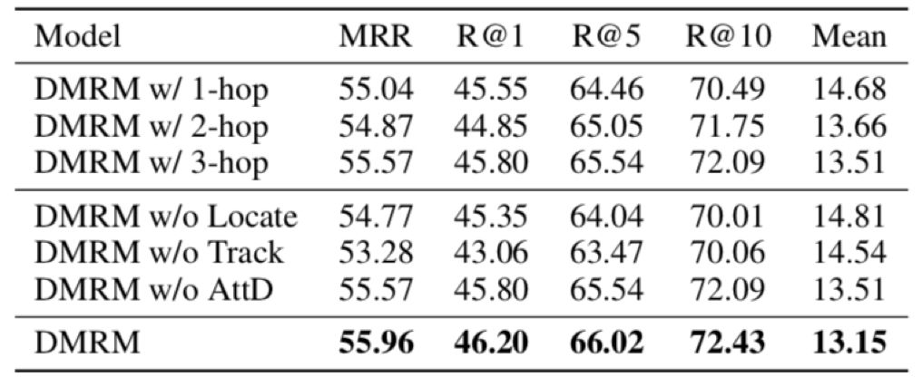 表3显示了双通道多步推理视觉对话生成模型DMRM的消融实验,分析了各个模块对于视觉对话任务效果的影响,可以看出双通道多步推理以及多模态解码器都起到了重要作用。