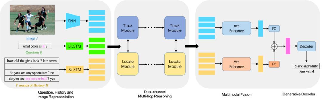 具体地说,DMRM维护一个跨模态交互的双通道(如图1所示,Track Module负责从视觉方面丰富问题的语义表示,Locate Module负责从对话历史方面丰富问题的语义表示),通过每个通道中的多步推理过程(如图2所示)获得与当前问题和对话历史相关的视觉特征,以及当前问题和输入图像相关的语言特征。此外,团队还设计了一种多模态注意机制,以进一步增强解码器来生成更准确的答复。