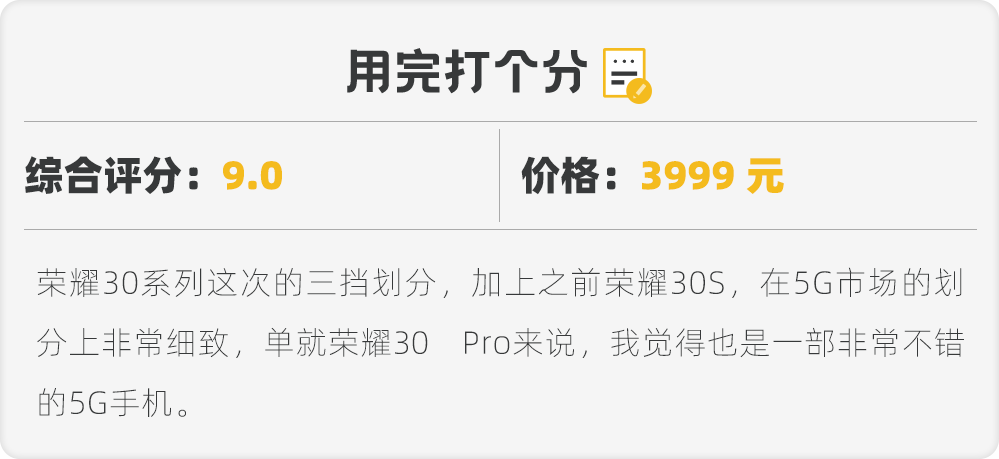 单就荣耀 30 Pro 来说,我觉得也是一部非常不错的 5G 手机,麒麟 990 5G 芯片、WiFi6、曲面屏、屏下指纹解锁、4000 万像素的潜望式三摄组合、前置双摄自拍、双扬声器、40W 快充和 4000mAh 电池容量,加上 magic UI 3.1 和荣耀生态体验,荣耀 30 Pro 都可以说是一部不错的 5G 手机。