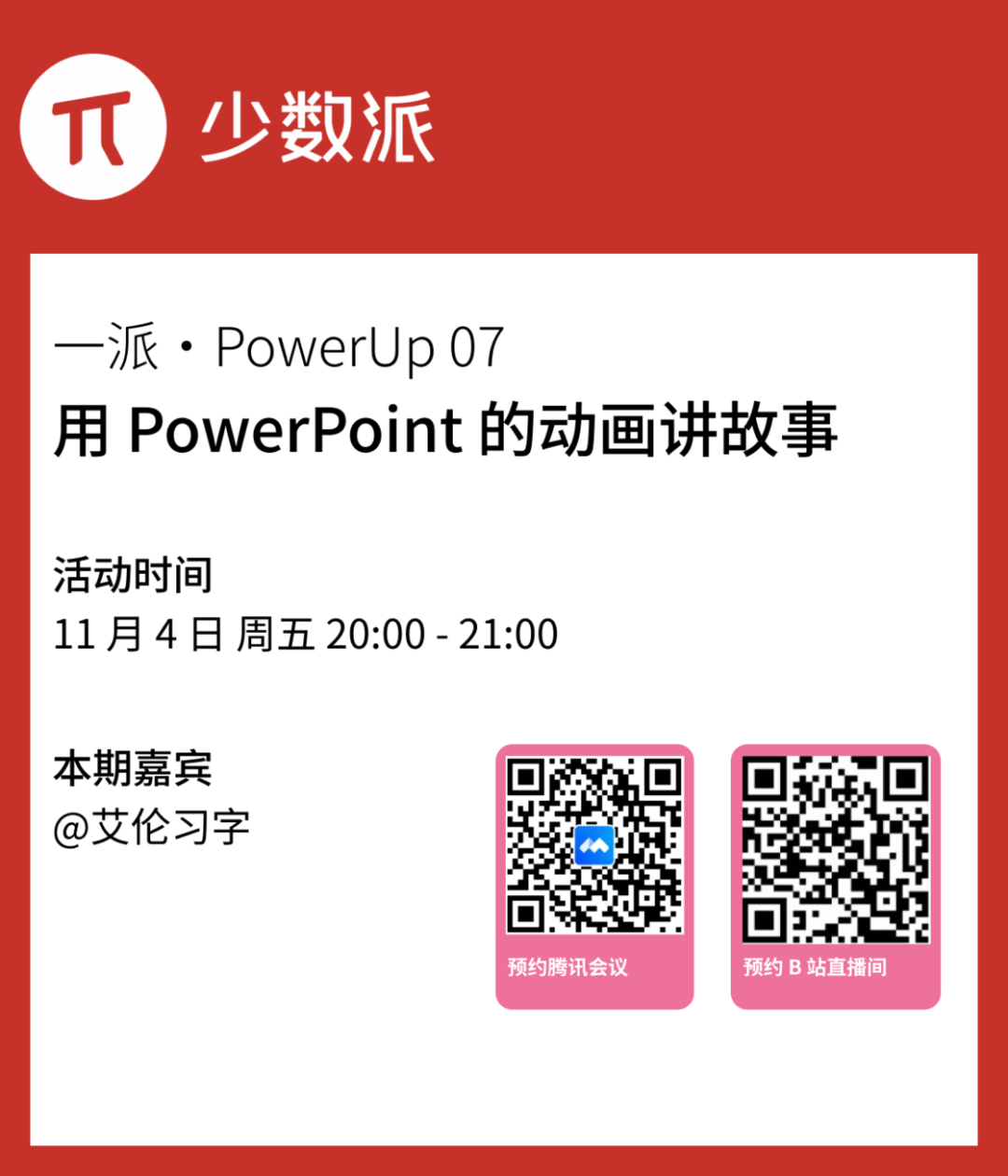 今晚(11.04)八点,我们将在少数派直播间举办「一派·PowerUp」直播活动。我们将与大家一同探讨如何使用 PowerPoint 动画来讲好故事、做好设计。