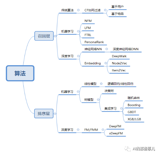 算法和模型层面是推荐系统的核心,也是评价推荐系统好坏的最关键的点。下图是我总结的在推荐系统中常用的算法和模型。