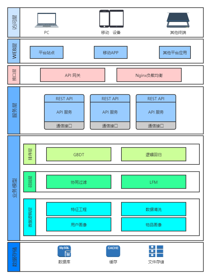 这张图是上个月给51CTO和第四范式做公开课的时候PPT中的一个图,这张图也是目前企业中将推荐系统落地的常见方式。我们从这张图中可以看到,实际上,一个推荐系统的落地从大的层面上我们可以将其分为6个部分。从下向上看,分别是数据存储、业务模型、服务层、接口层、web层和访问层。