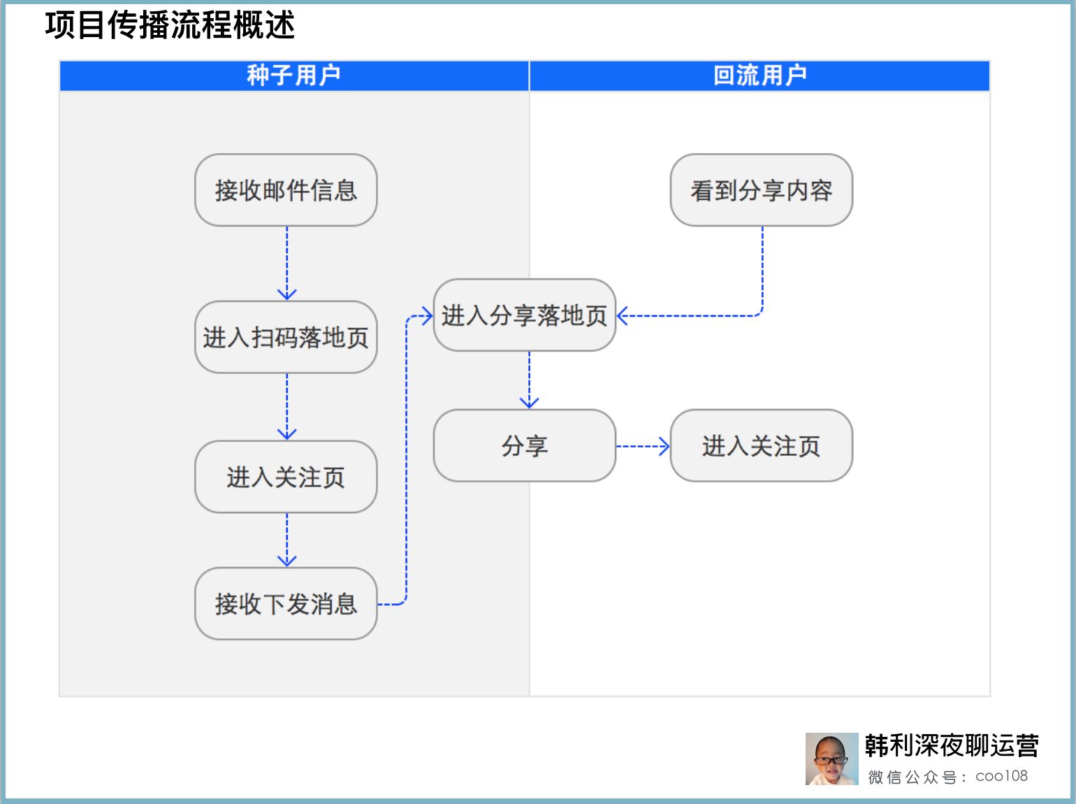 这个传播流程的大概意思就是:通过邮件来拉取站内种子用户,扫码后,进入关注页,关注微信号后,接收下发消息,点击进入分享落地页,然后引导用户分享到朋友圈或好友。好友看到分享内容后,点击进入分享落地页,依然是引导分享,然后引导回流用户进入关注页。