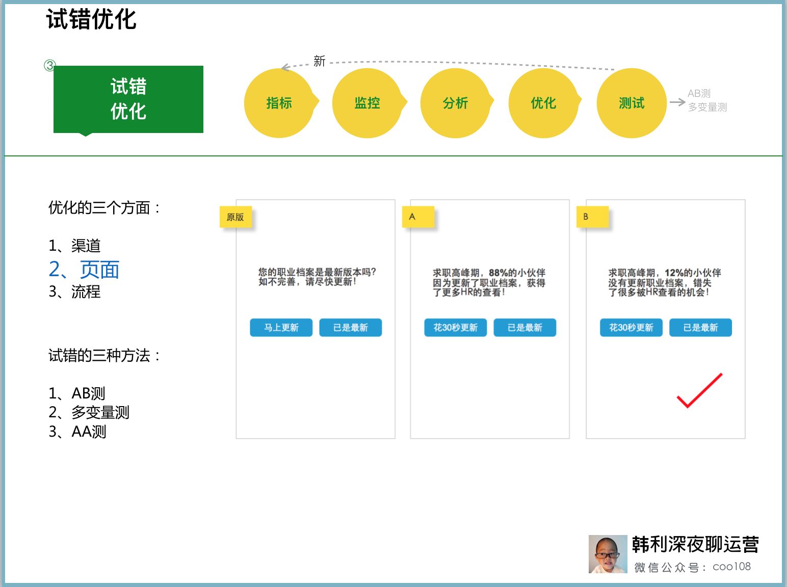 我先简单聊一下试错优化这个概念:在互联网产品中,优化主要包含三个方面的优化: