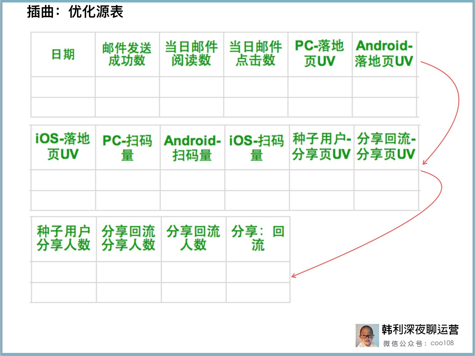 你别看我现在可以头头是道的讲,真进入到项目里,运营人往往会犯一个错误,什么数据都想看,追求完美。优化源表也是我被逼出来才琢磨的。因为如果你的公司有数据团队,他们往往不会像GA、GrowingIO这些工具一样,做到各种维度、各种可视化的效果——因为你的业务本身可能还没有定型,这时候去动用人力去给你做可视化报表,风险较高。