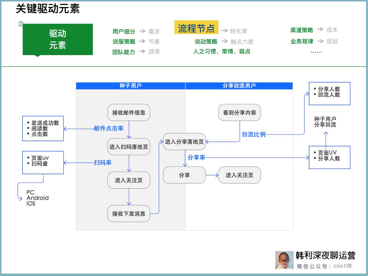这幅图有刚讲的传播流程,有拆解出来的关键节点指标;然后我又在此图的基础上加入了各个关键节点的驱动元素。