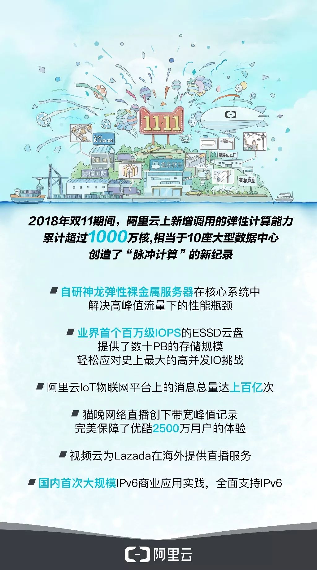 今年双11期间,阿里云上新增调用的弹性计算能力累计超过1000万核,相当于10座大型数据中心,创造了“脉冲计算”的新纪录。不仅如此,飞天2.0的新能力全面支撑双11: