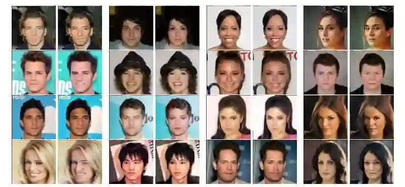 图 1:在每个图像对中,哪张(左或右)更有吸引力?模型提取与吸引力相关的正面/负面特征,并在不同的身份之间合成特定的高级面部特征。在每个示例中,左边是原始图像,右边是加工后的图像(从左到右:小鼻子/大鼻子,男性化/女性化,未化妆/已化妆,年轻/年长)。研究者通过用户研究进一步调查和验证了美貌的定义。