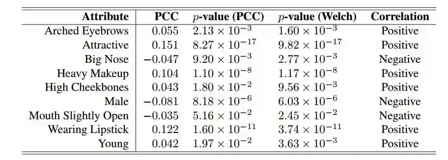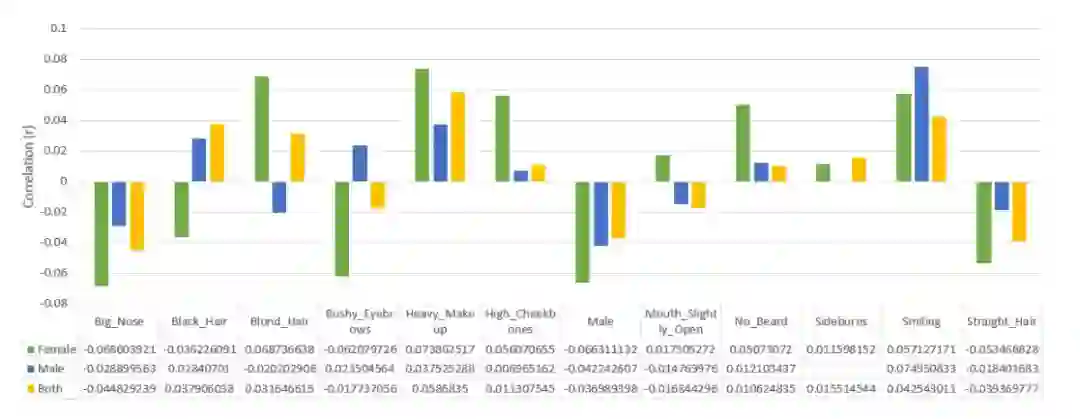 我们不仅能够通过数据统计得出关于美的客观定义,而且还有一个有趣的发现,女性化特征被认为比男性化特征更有吸引力。从心理学的角度来看,有大量证据表明女性特征增加了不同文化中男性和女性面孔的吸引力。浓妆和口红等特征通常被认为是女性的特征。因此,从我们的统计结果和心理学来看,这些属性对吸引力有积极的影响。此外,有一个名为男性化(Male)的性别属性,从我们的深度模型来看,这个预测在 CelebA 中是令人信服的(95 % 的准确率)。然而,我们发现了一个有趣的结果,一些来自 Beauty 799 数据库的女性图像在模型结果中被估计为男性,这表明这些女性有一些男性特征(男性倾向),并且她们被认为不太有吸引力。此外,根据相关性分析,这种男性化属性会降低吸引力。这个例子从反面证明了女性特征可以增加吸引力。