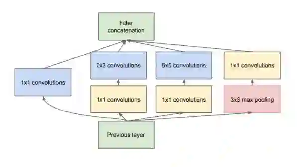 在本文中,我们采用 GoogleNet 架构来进行特征训练。该网络具有 22 层(仅计算了具有参数的层),9 个 Inception 模块。GoogLeNet 在 2014 年的 ImageNet 大型视觉识别挑战赛(ILSVRC14)中实现了分类和检测的最佳水平。该架构擅长使用 1×1 卷积核进行降维,可以在节省计算资源的同时增加网络深度,被称为 Inception,如图 5 所示。不同于 ImageNet 分类挑战赛,其中每个图像仅作为一个类别,在本文的训练中,每个图像及其 40 个特征被输入深度架构,最终输出是与真实值(40 个标签)对应的多个分类。
