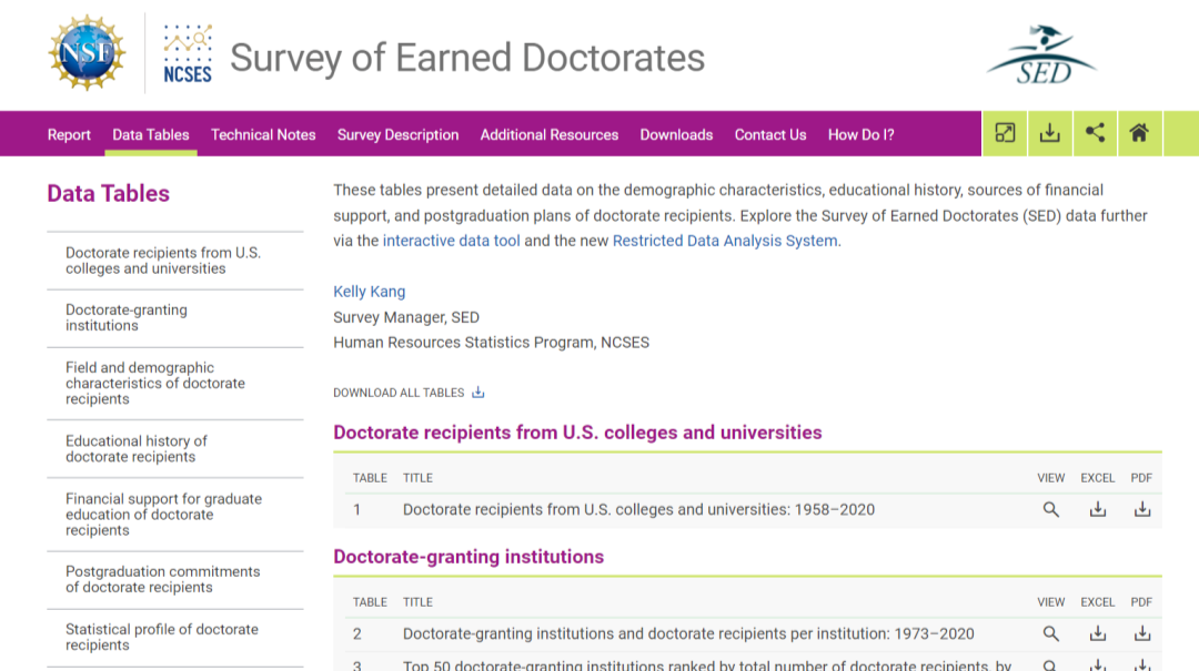 美国国家科学基金会对获得博士学位的年度调查跟踪了55283名在2020学年获得博士学位的研究人员。