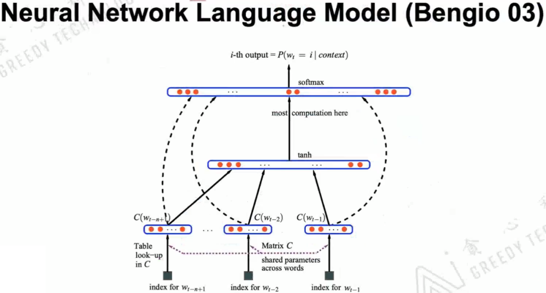 Neural Network Language Model根据之前的单词预测最新的一个单词,这里没有中心词的概念,只通过之前两三个单词来预测后面的一个单词。