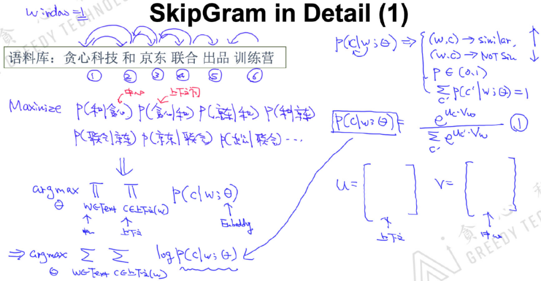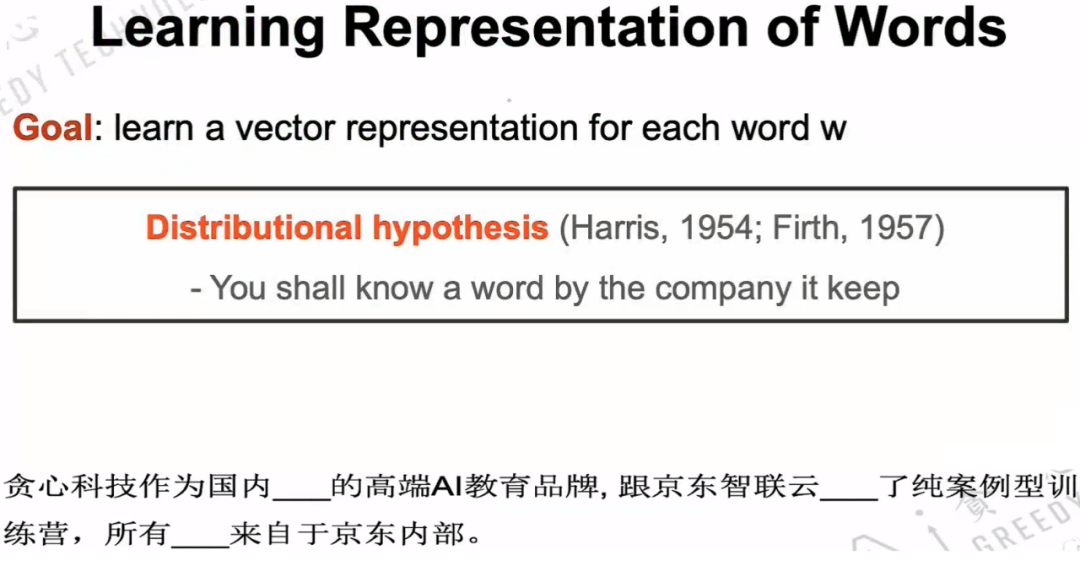 学习词向量有一个非常重要的理论:分布式假设,即一个单词的出现,跟它的上下文有关,我们可以根据上下文来预测某个单词。举个例子,我们可以根据上文“贪心科技作为国内”和下文“的高端AI教育品牌”,猜测出横线处应该是“领先”这个词。后边两个横线,分别从它们的上下文中,可以猜出应填词为“推出”、“案例”。