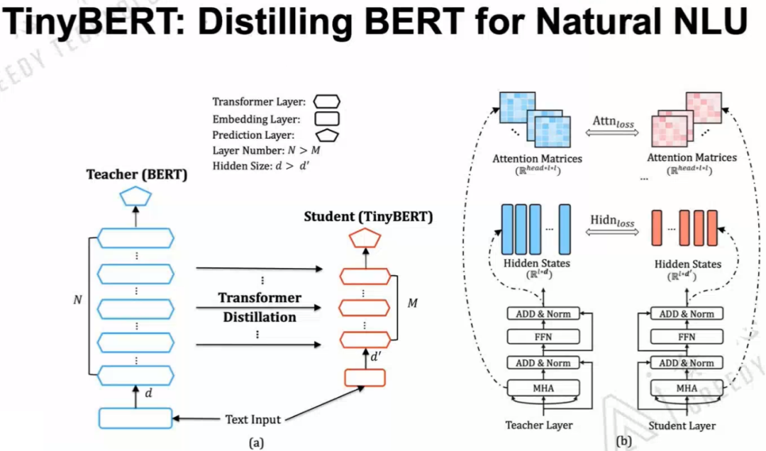 TinyBERT有两个模型如下图所示,左边的Teacher(BERT)有 层,右边的Student(TinyBERT)有 层,知识蒸馏就是把左边的模型迁移到右边的模型,且 。