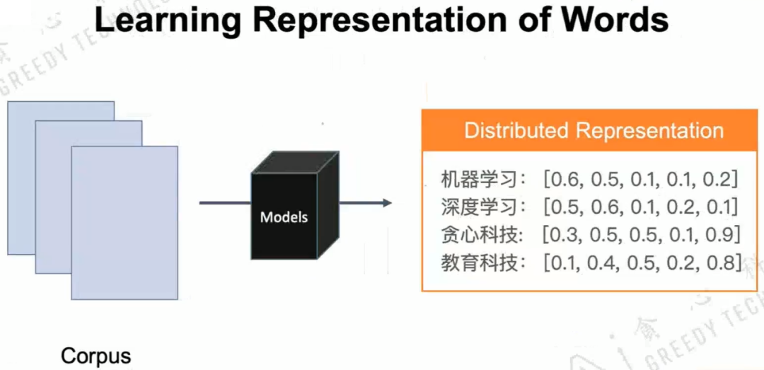 One-hot Encoding有什么问题呢?假如我想用余弦相似度计算上图中“机器学习”与“深度学习”的相似度,或者计算“贪心科技”与“深度学习”的相似度,我们会发现相似度的值都是相同的。也就是说,单词通过独热编码的方式是不能表示单词间语义的相似度。 由于这是独热编码最大的问题,因此科学家们开始研究如何对独热编码做改进,改进成一个向量可以表示单词的语义。如果我们能用一个向量表示单词的语义,那么两个向量的相似度应该可以表示两个单词语义的相似度。下图是我们对独热编码的一个总结。
