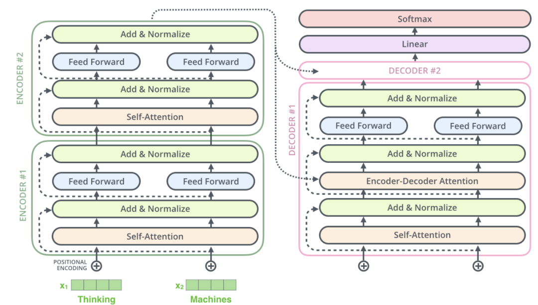 Transformer由两部分组成:Encoder、Decoder。Encoder部分有许多个Encoder Block组成。每个Encoder Block由五部分组成: