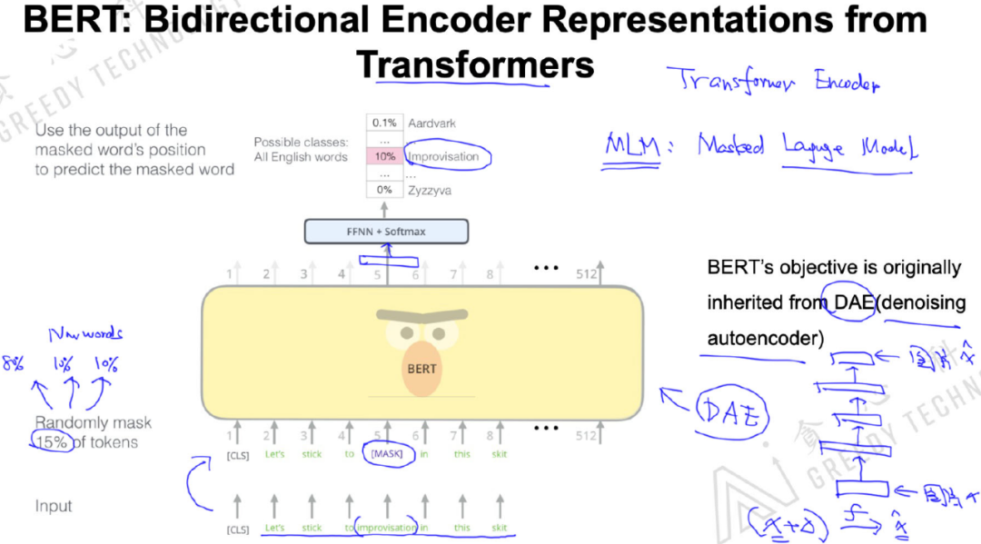 BERT使用Transformer的Encoder结构作为自己的组件。BERT训练的时候,随机把语料库中15%的单词做Mask操作。对于15%的单词做Mask操作分为三种情况:80%的单词直接用[Mask]替换、10%的单词直接替换成另一个新的单词、10%的单词保持不变,用这种方式训练的语言模型叫做MLM(Masked Language Model)。其实BERT的目标函数的核心思想来自于图像领域的DAE。