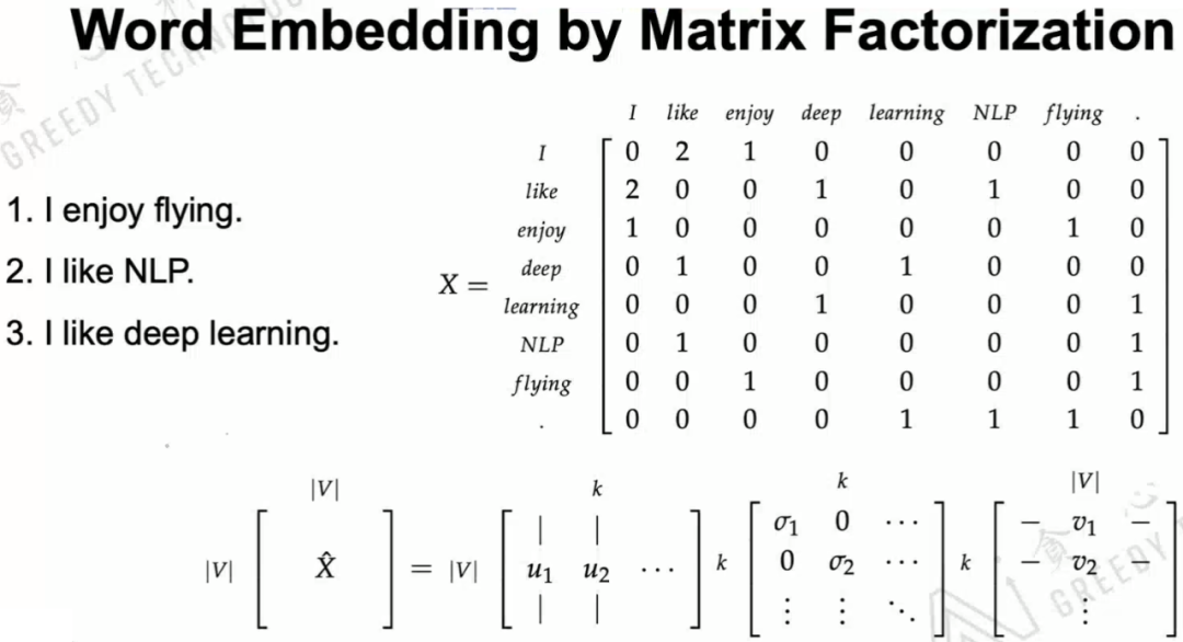 矩阵分解也是可以学习词向量的。假如我们有三个句子组成的语料库:I enjoy flying. I like NLP. I like deep learning. 我们可以统计出单词的共现矩阵(Co-occurrence Matrix) ,将共现矩阵行(列)作为词向量。例如:假设统计窗口大小为 ,“I like”出现在第 , 句话中,一共出现 次,所以“I like”= 。对称的窗口指的是,“like I”也是 次。将共现矩阵行(列)作为词向量表示后,可以知道“like”、“enjoy”都是在“I”附近且统计数目大约相等,因此它们意思相近。