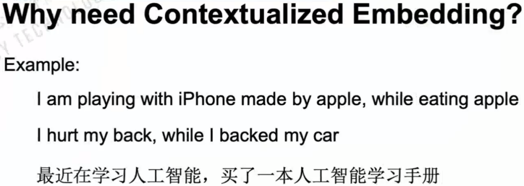 第一个例子中的第一个“apple”指苹果公司,第二个“apple”指水果苹果。假如我们用静态的词向量,那在整个语料中“apple”只能表示一个意思,不能表示单词在上下文中的一个区别。